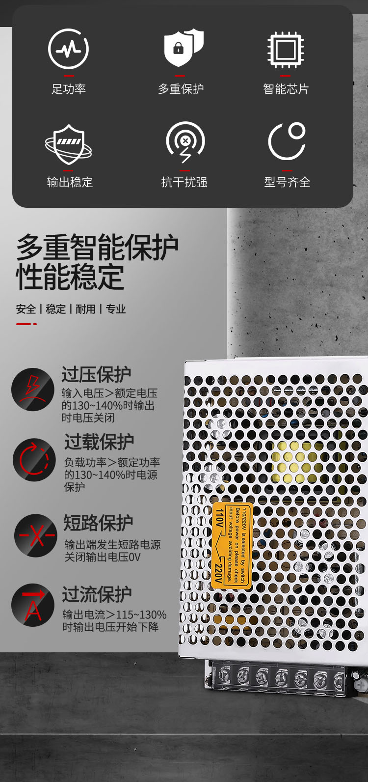 公司开关电源产品具性能稳定、安全可靠、使用寿命长等特点。